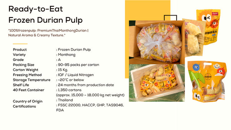 "Premium Thai durian, frozen at peak freshness for authentic taste and quality."